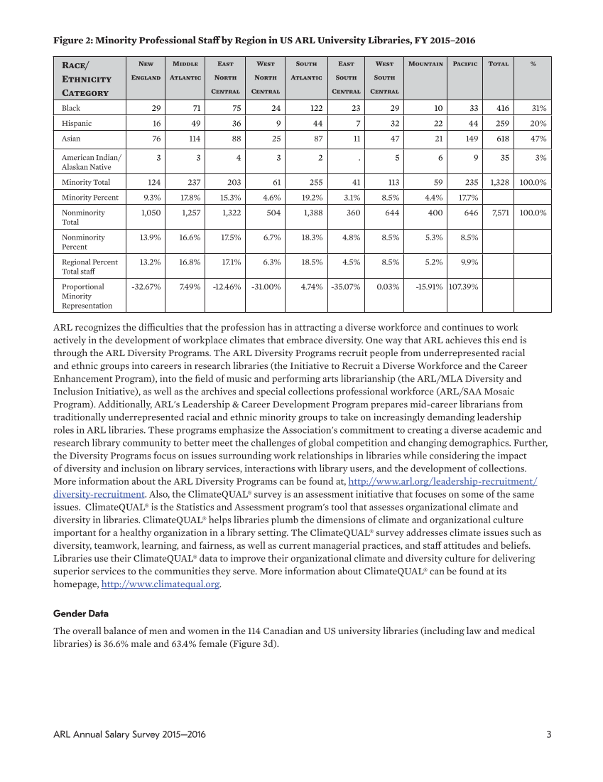 3 ARL Annual Salary Survey 2015–2016 Figure 2: Minority Professional Staff by Region in US ARL University Libraries, FY 2015–2016 Race/ Ethnicity Category New England Middle Atlantic East North Central West North Central South Atlantic East South Central West South Central Mountain Pacific Total %Black 29 71 75 24 122 23 29 10 33 416 31% Hispanic 16 49 36 9 44 7 32 22 44 259 20% Asian 76 114 88 25 87 11 47 21 149 618 47% American Indian/ Alaskan Native 3 3 4 3 2 .5 6 9 35 3% Minority Total 124 237 203 61 255 41 113 59 235 1,328 100.0% Minority Percent 9.3% 17.8% 15.3% 4.6% 19.2% 3.1% 8.5% 4.4% 17.7% Nonminority Total 1,050 1,257 1,322 504 1,388 360 644 400 646 7,571 100.0% Nonminority Percent 13.9% 16.6% 17.5% 6.7% 18.3% 4.8% 8.5% 5.3% 8.5% Regional Percent Total staff 13.2% 16.8% 17.1% 6.3% 18.5% 4.5% 8.5% 5.2% 9.9% Proportional Minority Representation -32.67% 7.49% -12.46% -31.00% 4.74% -35.07% 0.03% -15.91% 107.39% ARL recognizes the difficulties that the profession has in attracting a diverse workforce and continues to work actively in the development of workplace climates that embrace diversity. One way that ARL achieves this end is through the ARL Diversity Programs. The ARL Diversity Programs recruit people from underrepresented racial and ethnic groups into careers in research libraries (the Initiative to Recruit a Diverse Workforce and the Career Enhancement Program), into the field of music and performing arts librarianship (the ARL/MLA Diversity and Inclusion Initiative), as well as the archives and special collections professional workforce (ARL/SAA Mosaic Program). Additionally, ARL's Leadership &Career Development Program prepares mid-career librarians from traditionally underrepresented racial and ethnic minority groups to take on increasingly demanding leadership roles in ARL libraries. These programs emphasize the Association's commitment to creating a diverse academic and research library community to better meet the challenges of global competition and changing demographics. Further, the Diversity Programs focus on issues surrounding work relationships in libraries while considering the impact of diversity and inclusion on library services, interactions with library users, and the development of collections. More information about the ARL Diversity Programs can be found at, http://www.arl.org/leadership-recruitment/ diversity-recruitment. Also, the ClimateQUAL® survey is an assessment initiative that focuses on some of the same issues. ClimateQUAL® is the Statistics and Assessment program's tool that assesses organizational climate and diversity in libraries. ClimateQUAL® helps libraries plumb the dimensions of climate and organizational culture important for a healthy organization in a library setting. The ClimateQUAL® survey addresses climate issues such as diversity, teamwork, learning, and fairness, as well as current managerial practices, and staff attitudes and beliefs. Libraries use their ClimateQUAL® data to improve their organizational climate and diversity culture for delivering superior services to the communities they serve. More information about ClimateQUAL® can be found at its homepage, http://www.climatequal.org. Gender Data The overall balance of men and women in the 114 Canadian and US university libraries (including law and medical libraries) is 36.6% male and 63.4% female (Figure 3d).