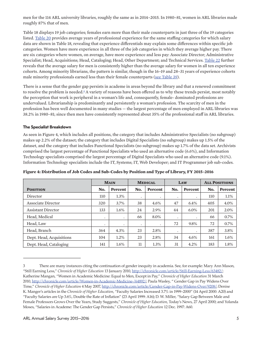 5 ARL Annual Salary Survey 2015–2016 men for the 114 ARL university libraries, roughly the same as in 2014–2015. In 1980–81, women in ARL libraries made roughly 87% that of men. Table 18 displays 19 job categories females earn more than their male counterparts in just three of the 19 categories listed. Table 20 provides average years of professional experience for the same staffing categories for which salary data are shown in Table 18, revealing that experience differentials may explain some differences within specific job categories. Women have more experience in all three of the job categories in which they average higher pay. There are six categories where women, on average, have more experience and less pay: Associate Director Administrative Specialist Head, Acquisitions Head, Cataloging Head, Other Department and Technical Services. Table 22 further reveals that the average salary for men is consistently higher than the average salary for women in all ten experience cohorts. Among minority librarians, the pattern is similar, though in the 16–19 and 28–31 years of experience cohorts male minority professionals earned less than their female counterparts (see Table 39). There is a sense that the gender gap persists in academe in areas beyond the library and that a renewed commitment to resolve the problem is needed.3 A variety of reasons have been offered as to why these trends persist, most notably the perception that work is peripheral in a woman’s life and, consequently, female- dominated professions are undervalued. Librarianship is predominantly and persistently a woman’s profession. The scarcity of men in the profession has been well documented in many studies — the largest percentage of men employed in ARL libraries was 38.2% in 1980–81 since then men have consistently represented about 35% of the professional staff in ARL libraries. The Specialist Breakdown As seen in Figure 4, which includes all positions, the category that includes Administrative Specialists (no subgroup) makes up 2.2% of the dataset the category that includes Digital Specialists (no subgroup) makes up 1.5% of the dataset, and the category that includes Functional Specialists (no subgroup) makes up 1.7% of the data set. Archivists comprised the largest percentage of Functional Specialists who used an alternative code (6.6%), and Information Technology specialists comprised the largest percentage of Digital Specialists who used an alternative code (9.1%). Information Technology specialists include the IT, Systems IT, Web Developer and IT Programmer job sub-codes. Figure 4: Distribution of Job Codes and Sub-Codes by Position and Type of Library, FY 2015–2016 Position Main Medical Law All Positions No. Percent No. Percent No. Percent No. Percent Director 110 1.3% ....110 1.1% Associate Director 320 3.7% 38 4.6% 47 6.4% 405 4.0% Assistant Director 133 1.6% 24 2.9% 44 6.0% 201 2.0% Head, Medical ..66 8.0% ..66 0.7% Head, Law ....72 9.8% 72 0.7% Head, Branch 364 4.3% 23 2.8% ..387 3.8% Dept. Head, Acquisitions 104 1.2% 23 2.8% 34 4.6% 161 1.6% Dept. Head, Cataloging 141 1.6% 11 1.3% 31 4.2% 183 1.8% 3 There are many instances citing the continuation of gender inequity in academia. See, for example: Mary Ann Mason, “Still Earning Less,” Chronicle of Higher Education 13 January 2010, http://chronicle.com/article/Still-Earning-Less/63482/ Katherine Mangan, “Women in Academic Medicine: Equal to Men, Except in Pay,” Chronicle of Higher Education 31 March 2010, http://chronicle.com/article/Women-in-Academic-Medicine-/64892/ Paula Wasley, “ Gender Gap in Pay Widens Over Time,” Chronicle of Higher Education 4 May 2007, http://chronicle.com/article/Gender-Gap-in-Pay-Widens-Over/9208/ Denise K. Manger’s articles in the Chronicle of Higher Education, “Faculty Salaries Increased 3.7% in 1999–2000” (14 April 2000: A20) and “Faculty Salaries are Up 3.6%, Double the Rate of Inflation” (23 April 1999: A16) D. W. Miller, “Salary Gap Between Male and Female Professors Grows Over the Years, Study Suggests,” Chronicle of Higher Education, Today’s News, 27 April 2000 and Yolanda Moses, “Salaries in Academe: The Gender Gap Persists,” Chronicle of Higher Education 12 Dec. 1997: A60.