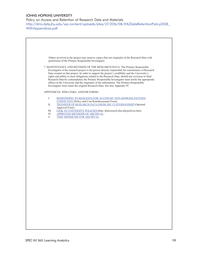 119 SPEC Kit 360: Learning Analytics JOHNS HOPKINS UNIVERSITY Policy on Access and Retention of Research Data and Materials http://dms.data.jhu.edu/wp-content/uploads/sites/27/2016/08/JHUDataRetentionPolicy2008_ WithAppendices.pdf Others involved in the project may remove copies (but not originals) of the Research Data with permission of the Primary Responsible Investigator. 7. MAINTENANCE AND REVISION OF THE RESEARCH DATA: The Primary Responsible Investigator of the research project is the person directly responsible for maintenance of Research Data created on that project. In order to support the project’s credibility and the University’s rights and ability to meet obligations related to the Research Data, should any revisions to final Research Data be contemplated, the Primary Responsible Investigator must notify the appropriate offices in the University and the originator of the information. The Primary Responsible Investigator must retain the original Research Data. See also Appendix IV. APPENDICES, WEB LINKS, AND/OR FORMS: I. RESPONDING TO REQUESTS FOR ACCESS BY NON-HOPKINS ENTITIES UNDER FOIA (Policy and Cost Reimbursement Form) II. TRANSFER OF RESEARCH DATA FROM JHU CUSTODIANSHIP (Optional Approval Form) III. LINK TO UNIVERSITY POLICIES (http://jhuresearch.jhu.edu/policies.htm) IV. APPROVED METHODS OF ARCHIVAL V. TIME MINIMUMS FOR ARCHIVAL
