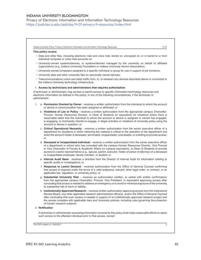 83 SPEC Kit 360: Learning Analytics INDIANA UNIVERSITY BLOOMINGTON Privacy of Electronic Information and Information Technology Resources https://policies.iu.edu/policies/it-07-privacy-it-resources/index.html Indiana University Policy: Privacy of Electronic Information and Information Technology Resources IT-07 This PDF created on: 10/02/2017 2 This policy covers: • Data and other files, including electronic mail and voice mail, stored on, encrypted on, or in transit to or from individual computer or voice mail accounts on: • University-owned systems/devices, or systems/devices managed by the university on behalf of affiliated organizations (e.g. Indiana University Foundation or Indiana University Alumni Association) • University-owned computers assigned to a specific individual or group for use in support of job functions • University data and other university files on personally owned devices • Telecommunications (voice and data) traffic from, to, or between any devices described above or connected to the Indiana University technology infrastructure. 1. Access by technicians and administrators that requires authorization A technician or administrator may access or permit access to specific information technology resources and electronic information as defined in this policy, in any of the following circumstances, if the technician or administrator: 1. a. Permission Granted by Owner - receives a written authorization from the individual to whom the account or device or communication has been assigned or attributed or b. Violations of Law or Policy - receives a written authorization from the appropriate campus Chancellor, Provost, Human Resources Director, or Dean of Students (or equivalent) for situations where there is reasonable belief that the individual to whom the account or device is assigned or owned has engaged, is engaging, or imminently intends to engage, in illegal activities or violations of university policy using the account or device in question or c. Critical Operational Necessity - receives a written authorization from the senior executive officer of a department for situations in which retrieving the material is critical to the operation of the department and when the account holder is deceased, terminated, incapacitated, unavailable, or unwilling to provide access or d. Deceased or Incapacitated Individual - receives a written authorization from the senior executive officer of a department or school who has consulted with the campus Human Resources Director, Vice Provost or Vice Chancellor of Faculty & Academic Affairs (or campus equivalent), or Dean of Students to provide access to a lawful representative (e.g., spouse, parent, executor, holder of power of attorney) of a deceased or incapacitated employee, faculty member, or student or e. Internal Audit Need - receives a directive from the Director of Internal Audit for information relating to specific audits or investigations or f. Response to Lawful Demand - receives authorization from the Office of General Counsel confirming that access is required under the terms of a valid subpoena, warrant, other legal order, or contract, or an applicable law, regulation, or university policy or g. Substantial University Risk – receives an authorization (written, or verbal with written confirmation) from the appropriate campus Chancellor, Provost, Vice President, or equivalent approving access after concluding that access is needed to address an emergency or to avoid or minimize exposure of the university to substantial risk of harm or liability h. Institutionally Approved Research – receives written authorization approving access from the Institutional Review Board, any other applicable research administrative office(s), and/or the Office of General Counsel after concluding that such access is needed in support of an institutionally approved research project and the access complies with applicable laws and University policies, including rules governing the protection of human research subjects. 2. Notification A technician or administrator accessing information covered by this policy shall make reasonable efforts to report such access to the affected individual prior to that access, except: