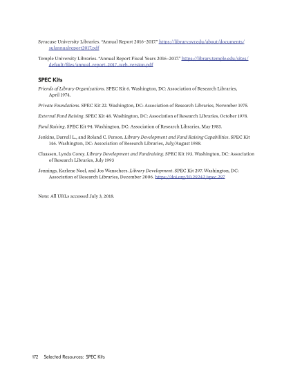 172 Selected Resources: SPEC Kits Syracuse University Libraries. “Annual Report 2016–2017.” https://library.syr.edu/about/documents/ sulannualreport2017.pdf Temple University Libraries. “Annual Report Fiscal Years 2016–2017.” https://library.temple.edu/sites/ default/files/annual_report_2017_web_version.pdf SPEC Kits Friends of Library Organizations. SPEC Kit 6. Washington, DC: Association of Research Libraries, April 1974. Private Foundations. SPEC Kit 22. Washington, DC: Association of Research Libraries, November 1975. External Fund Raising. SPEC Kit 48. Washington, DC: Association of Research Libraries, October 1978. Fund Raising. SPEC Kit 94. Washington, DC: Association of Research Libraries, May 1983. Jenkins, Darrell L., and Roland C. Person. Library Development and Fund Raising Capabilities. SPEC Kit 146. Washington, DC: Association of Research Libraries, July/August 1988. Claassen, Lynda Corey. Library Development and Fundraising. SPEC Kit 193. Washington, DC: Association of Research Libraries, July 1993 Jennings, Karlene Noel, and Jos Wanschers. Library Development. SPEC Kit 297. Washington, DC: Association of Research Libraries, December 2006. https://doi.org/10.29242/spec.297 Note: All URLs accessed July 3, 2018.